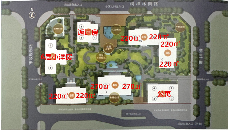 其中北地块为此次住宅所在地块,占地约20亩,总共规划了7栋建筑,其中1、2、5号楼的户型为220㎡的住宅,4号楼为270㎡的住宅,3号楼为2T4的公寓产品,6号楼为洋房,7号楼为返迁住宅(置业顾问称返迁对象为原中国酒城股东)——换句话说,在这宗仅有20亩的地块上,排布了住宅、返迁房、商业公寓三种形态,且商品住宅和返迁未设置分隔。