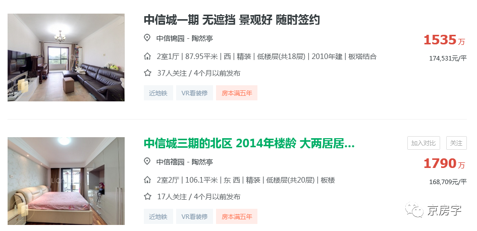 而且从市场来看,目前在几个头部中介的平台上,中信城目前的二手房挂牌价在17万元/平米左右,因此即便是之前传的消息是20万的单价,有意向的购房者也并没有觉得这个价格“离谱”。所以最终16.5万的单价,可以说也是低于这些购房者的预期。