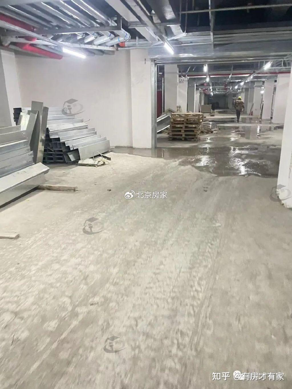 目前室内墙面已经刷了大白,厨房及卫生间的瓷砖也已经贴完了瓷砖,地面还是水泥状态,整体室内的进度不大!地下车库内部各个角度实拍,地面上码放了些建筑施工材料,墙面同样刷了白!整体的进度也不大。