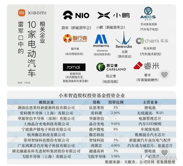 因为雷军在制造业摸爬滚打十几年,而且雷军、小米、顺为资本三驾马车投资了众多产业链上下游的公司。下图只是雷军、小米、顺为投资的部分新能源汽车、芯片公司,大家熟悉的小鹏和蔚来雷军也有投资。