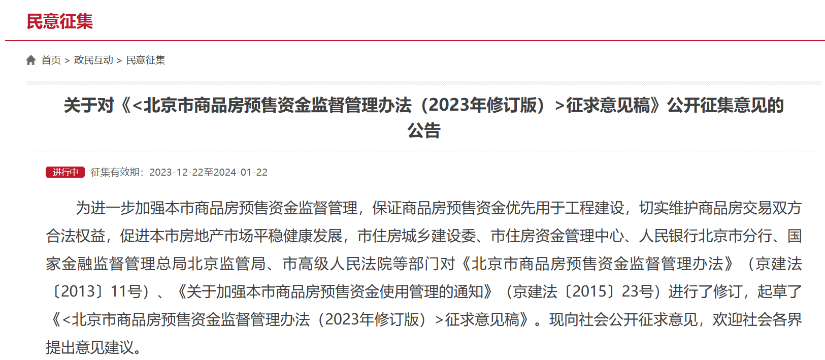 12月22日,北京住建委发布关于对《<北京市商品房预售资金监督管理办法(2023年修订版)>征求意见稿》(下称《办法》)公开征集意见的公告,对《办法》进行修订完善。