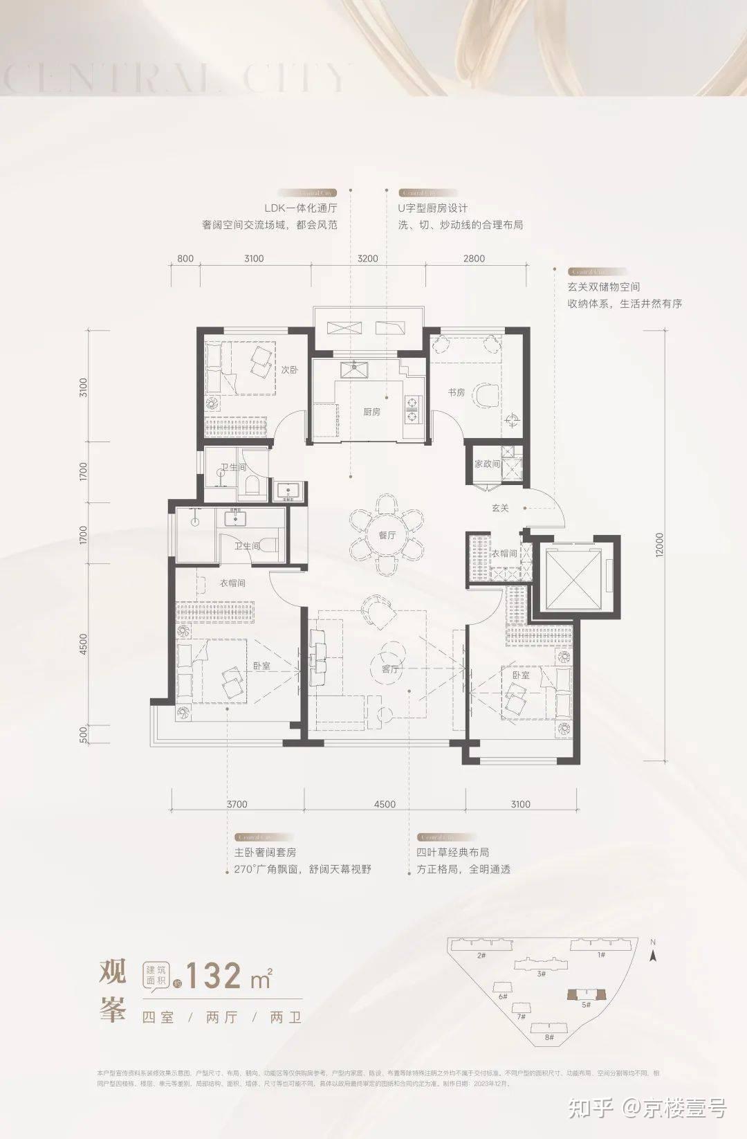132平四室两厅两卫,四叶草格局,南向面宽11.3米,客厅面宽4.5米,户型方正通透,同样主卧拐角飘窗;
