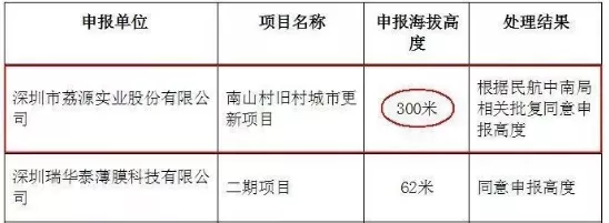 《深圳机场净空巡视情况月报二0一五年九月》中也提到了南山村旧改而且已经透露了项目将建超高层建筑申报的海拔高度是300米处理结果是“同意申报高度”。