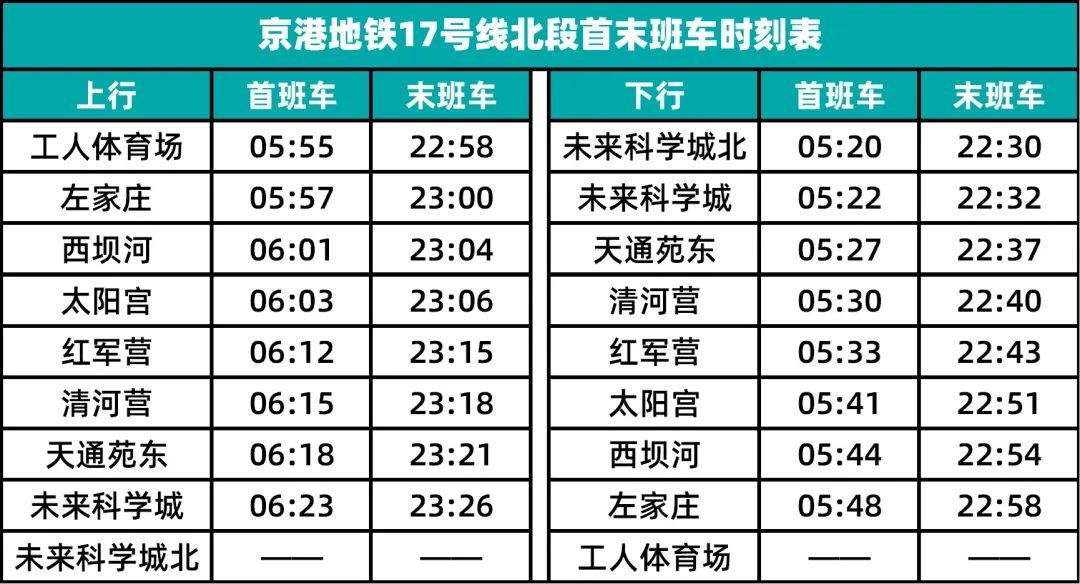 据京港地铁消息,明日(12月30日)首班车起,地铁17号线北段(工人体育场-未来科学城北)将开始运行。首末班车时刻表也已同步公布。