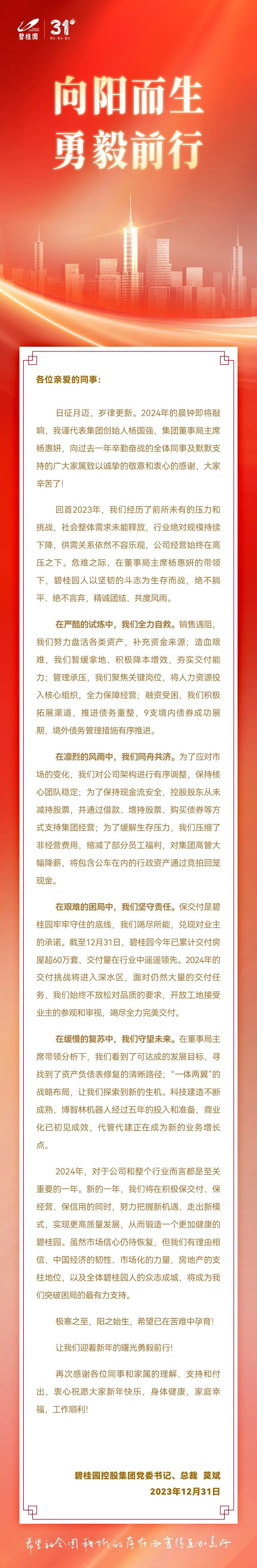 碧桂园集团总裁新年致辞 | 向阳而生 勇毅前行北京二手房2年前发布关注私信03113 © 版权声明声明:本站内容来源于网络或叭楼会员发布,网站只作为信息发布平台,版权归原作者所有,本站不承担任何图片、内容、观点等内容版权问题,如对内容有歧义,可第一时间联系本站管理员,经核实后我们会第一时间删除。THE END楼市新闻行业动态# 楼市新闻# 房产新闻# 碧桂园# 新年献词 喜欢就支持一下吧点赞13 分享QQ空间微博QQ好友海报分享复制链接收藏