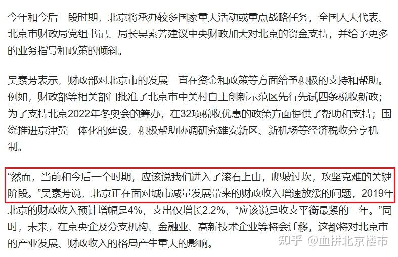 自2017年落实减量发展两年后,全国人大代表、北京财政局局长就在两会上提出:建议中央财政加大对北京重大任务的资金支持,因为北京在减量发展后面临着财政收入增速放缓的问题。