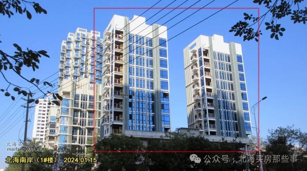 北海南岸,位于金海岸大道交广东路以西。项目共规划建设5栋住宅楼,一期(2-5#楼)已建成交付,二期(1#楼)烂尾中。1#楼2019年8月取得预售证,共推出住宅36套。