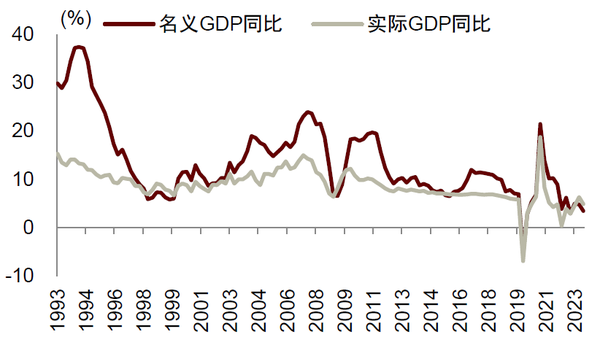 虽然取得了5.2%的经济增速,但是考虑到2023年CPI仅为0.2%,GDP名义增速还是比较低的,名义增速对居民的体感温度影响更直接。