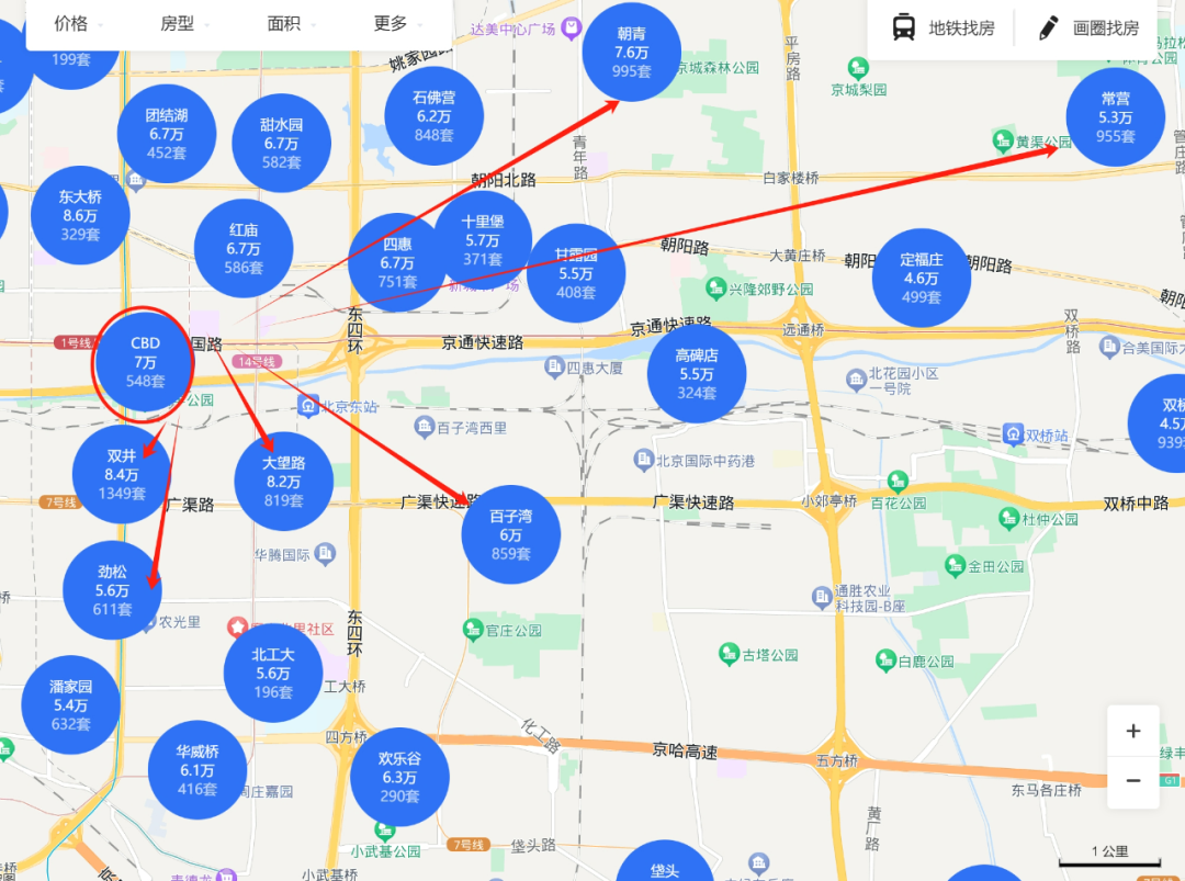 朝阳南距离国贸比较近,但朝阳南也不是国贸最直接的外溢板块。从通勤来看,大部分在国贸工作买家会习惯性选择东边1号线、6号沿线居住板块,比如青年路,常营等,或10号线,沿着三环的双井、潘家园、角门、草桥,这些板块环线位置好,通勤方便,而且周围商业、医疗、学校配套不错,居住氛围比朝阳南普遍更好。所以,朝阳南指望望京外溢,距离太远了,指望国贸外溢,竞品截流的板块又很多。指望朝阳南崛起,就像指望渣男靠得住一样,确实不太现实啊。