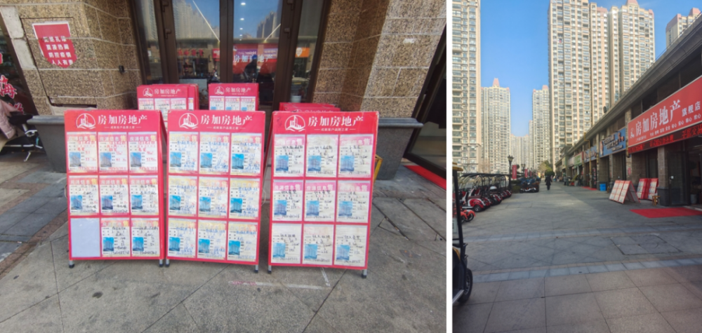 街上的中介店,外面挂着优质二手房源,热情的中介小哥努力介绍着