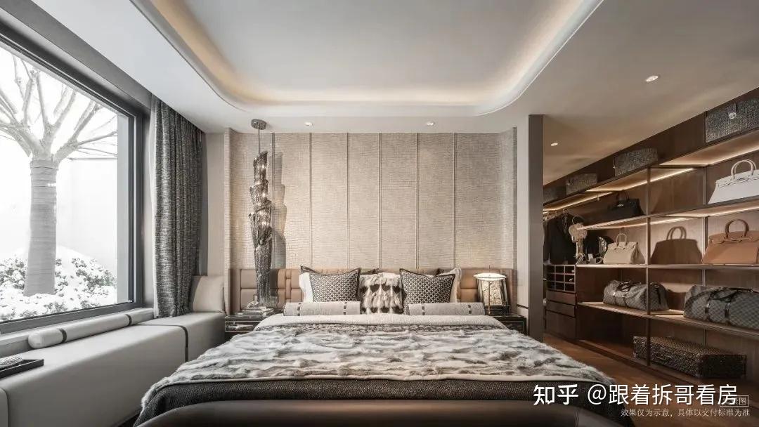 元玺196的主卧套房,南向面宽约6.5米,背景墙采用仿鳄鱼皮材质搭配古铜色金属线条。视觉上的痛快,会让人能够真正感受到“Keep wealth in the asset”。
