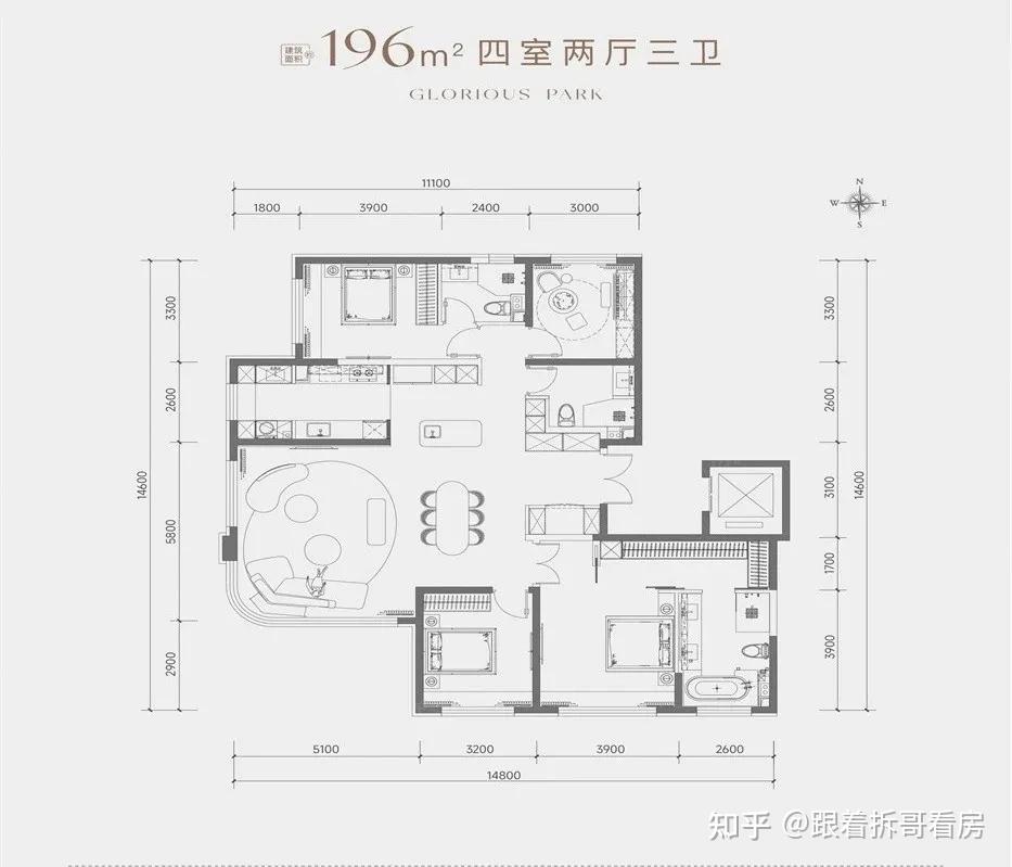 元玺建面约196㎡的户型名为“无界”,是一眼便让人心生激荡的“顶奢改善”:南向总面宽约14.8米。