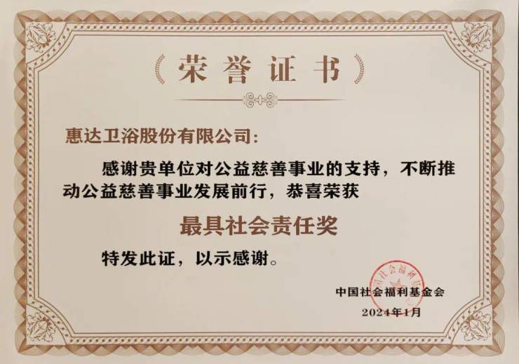 本次荣获“最具社会责任奖”荣誉,既是对过去努力的认可,更是对未来责任的鞭策。未来,惠达卫浴将继续积极参与更多的社会公益项目,践行企业担当,关爱社会、造福社会、回馈社会,用实际行动为中国公益事业做出更多贡献。