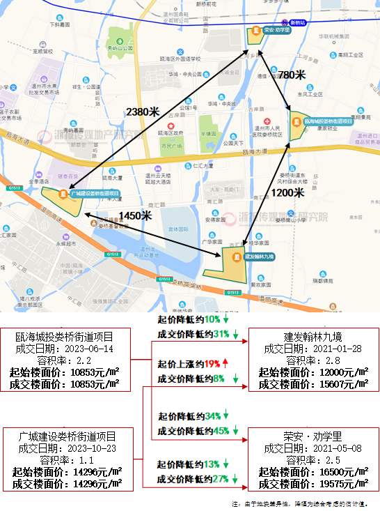 温州典型地块,如瓯海中心区板块的广城建设娄桥街道项目,为1.1低密宅地,相比2021年荣安·劝学里成交楼面价降幅约27%;相比建发翰林九境成交楼面价降幅约8%,两者容积率均在2.5以上。