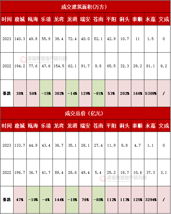 2023年温州市涉宅地分区县成交同比情况表