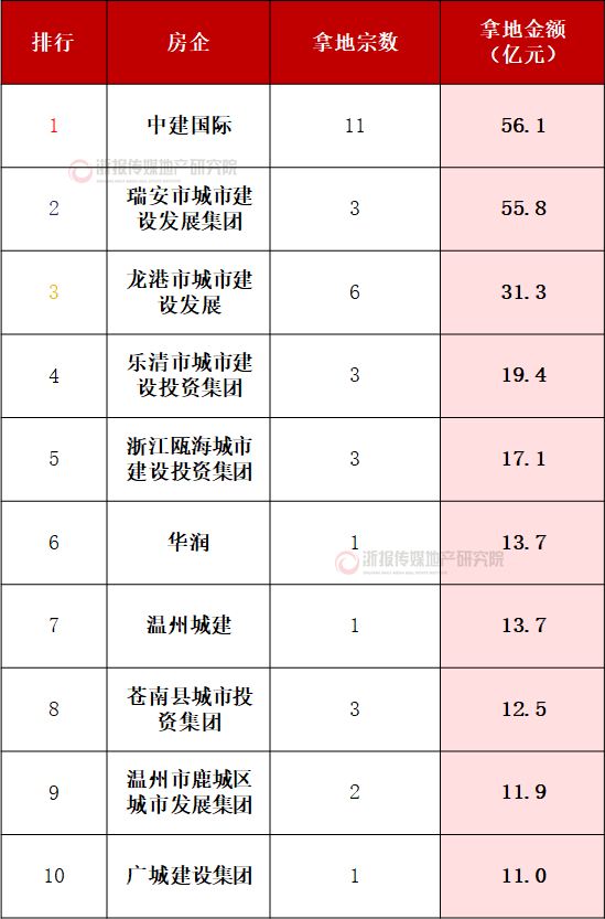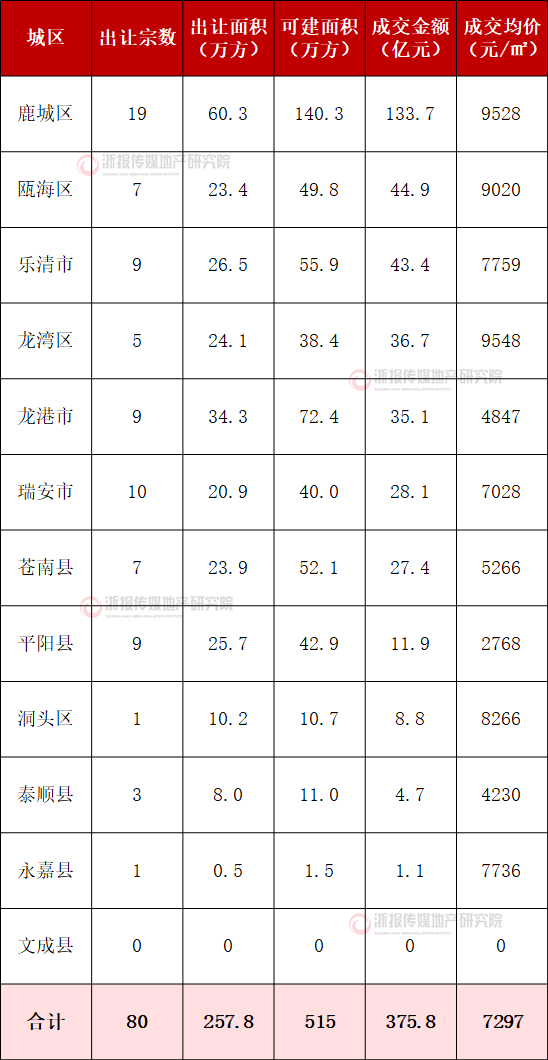 分区来看,鹿城区成交金额全市占比达到35.6%,其次为瓯海区、龙湾区,县市中乐清出让金额超40亿,龙港、瑞安、苍南超过20亿。