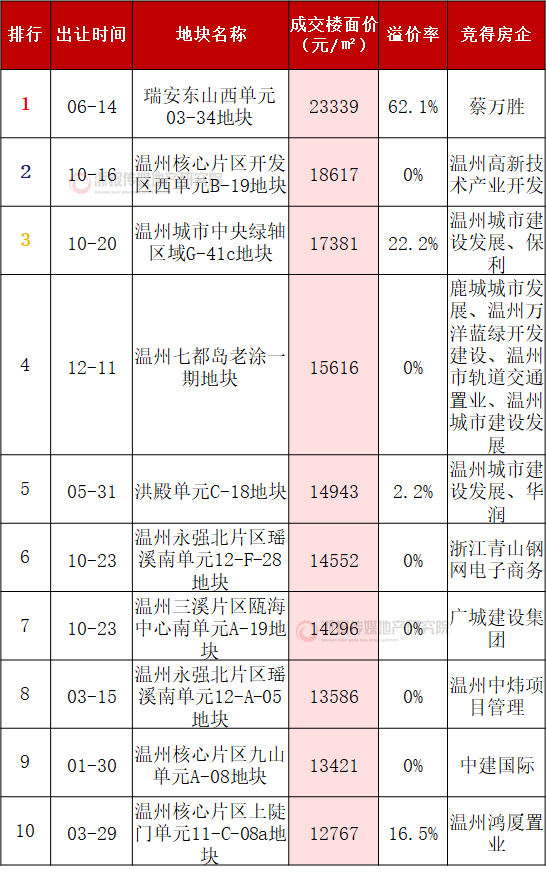 2023年温州市涉宅地成交单价排行榜(top10)