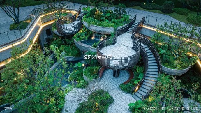 据说项目会参考的南京天琴华樟项目,下沉式庭院采用如图中这样的立体景观,6米多高的立体景观,有点期待最终呈现效果。
