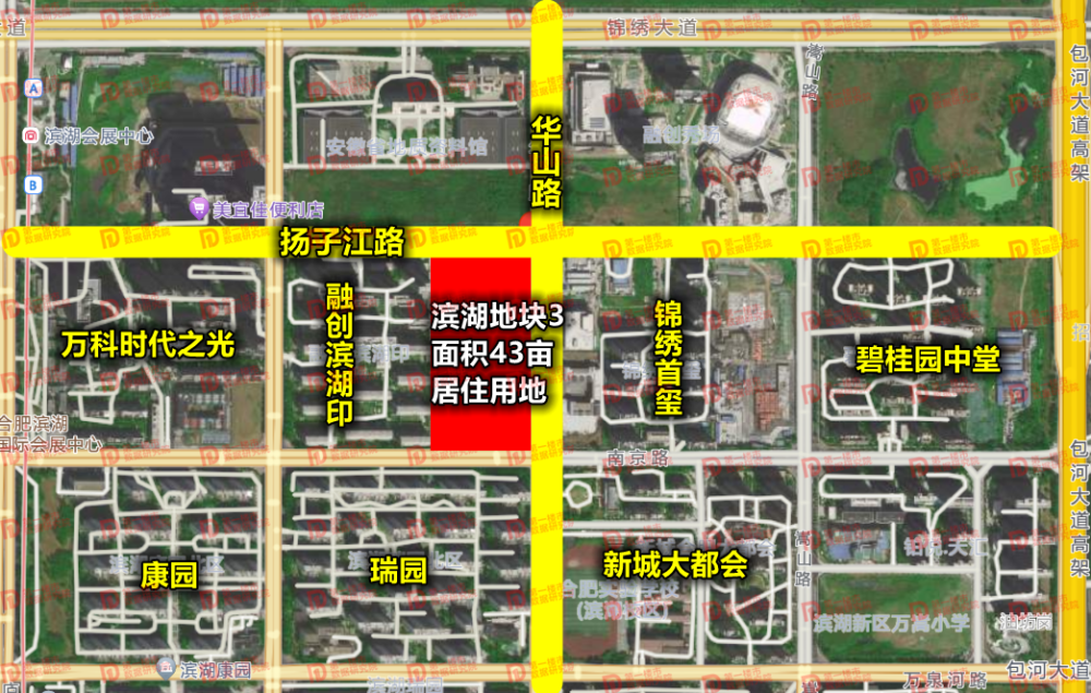 第3宗地块位于华山路与扬子江路交口西南角,隔壁就是融创滨湖印,地块容积率1.8,面积43亩,需代建一座12班(9+3)幼儿园以及7.7亩公园绿地。