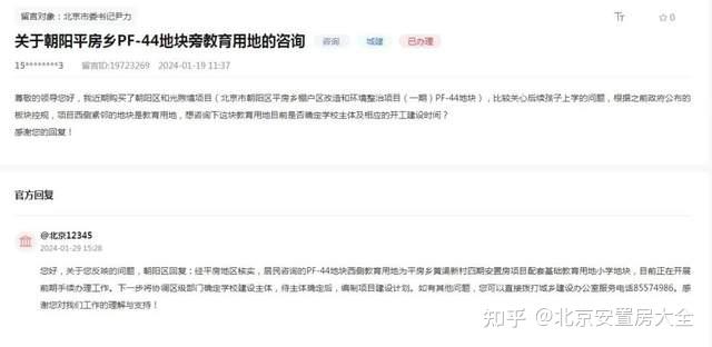 您好,关于您反映的问题,朝阳区回复:经平房地区核实,居民一对一咨询PF-44地块东面教育用地为平房乡于家村新立村第三期项目工程配套高中教育用地小学地块,目前还在进行项目立项审批代表建议办理。将尽快协调省级以上部门确定学校社会资本方,待主体认可后,编制项目建设指标。如有诸多问题,请随时拔打城市规划建设办公室举报投诉电话。感谢您对我们工作的理解与支持!
