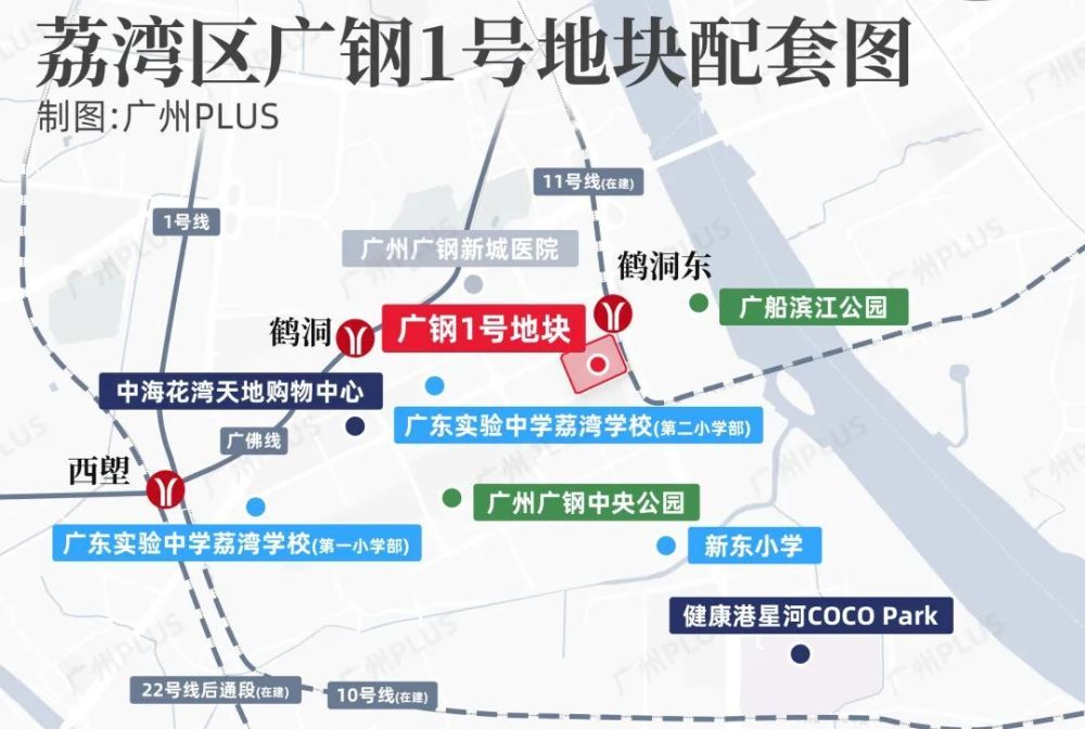 广钢1号地块是商业用地兼容二类居住用地,其中居住用地建面约8.7万㎡,商业用地建面则超10万㎡,紧邻大环线11号线(在建)鹤洞东站。