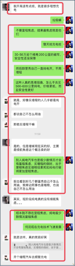 因为绝大部分增程纯电实际行驶里程不超过200公里,他们为了纯电行驶就得频繁抢充电桩。然后群里秀自己一直纯电开,不用增程。