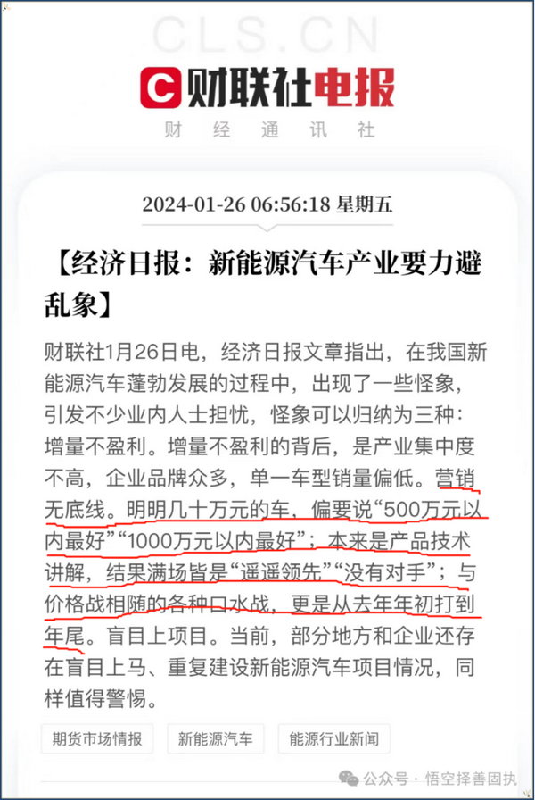 官媒直言汽车三大怪象,其中一条是:【营销无底线。明明几十万元的车,偏要说“500万元以内最好”“1000万元以内最好”;本来是产品技术讲解,结果满场皆是“遥遥领先”“没有对手”;与价格战相随的各种口水战,更是从去年年初打到年尾。】(这描述的哪家公司已经很直白了!)