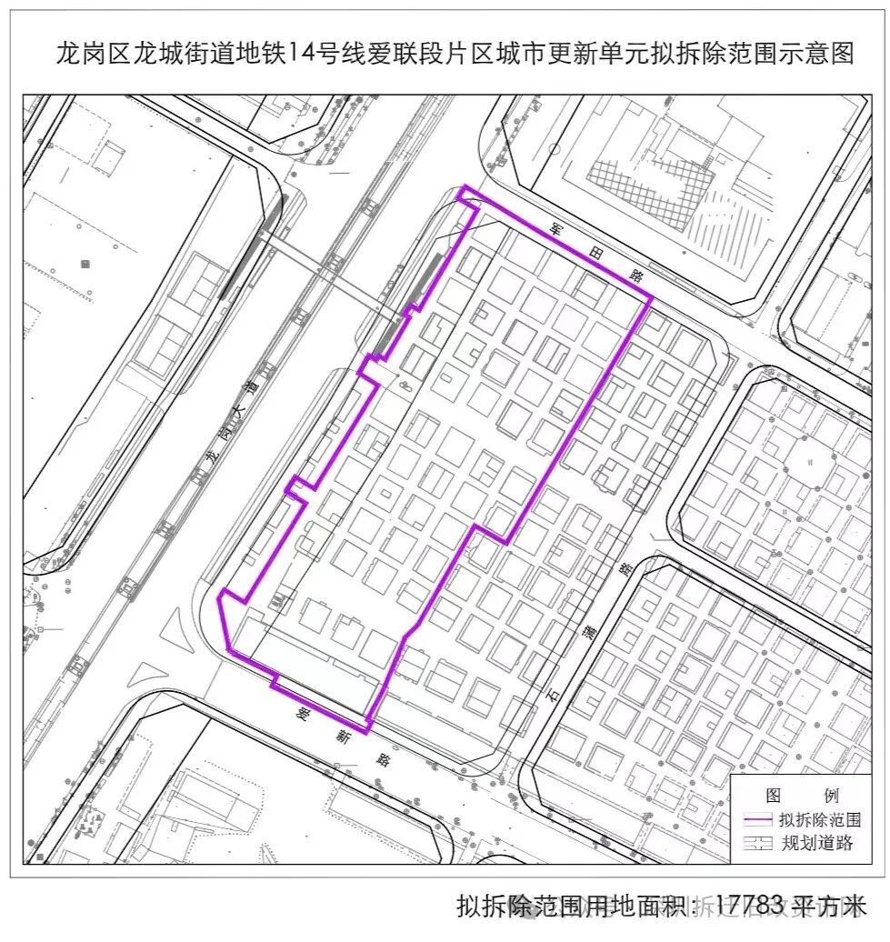 龙岗区龙城街道地铁14号线爱联段片区城市更新单元拟拆除重建范围面积17783㎡,拟更新方向为居住等功能。