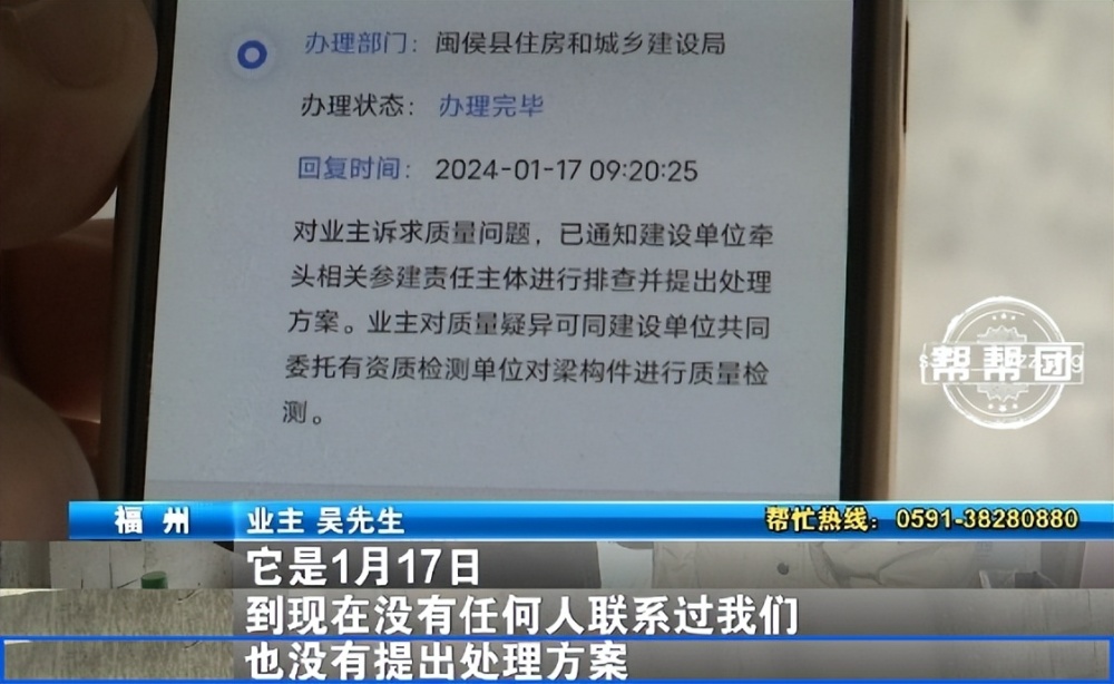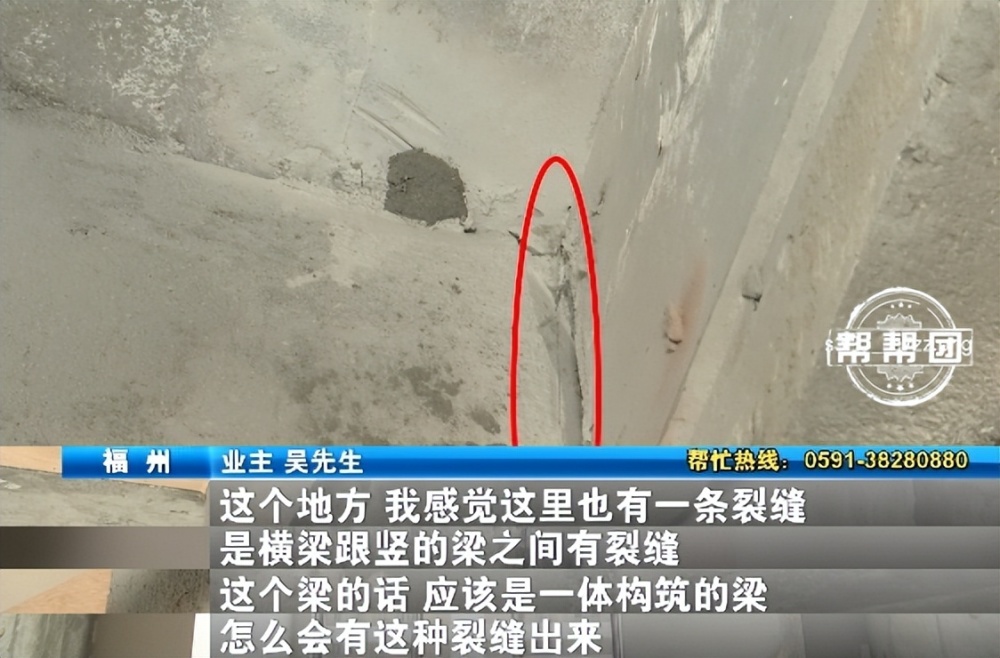 福州一小区业主吴先生在问政平台《第一帮帮团》微信小程序上反映,2023年12月,他着手装修新房时,木工师傅突然发现大梁有个裂缝,这让他担心不已。