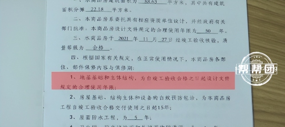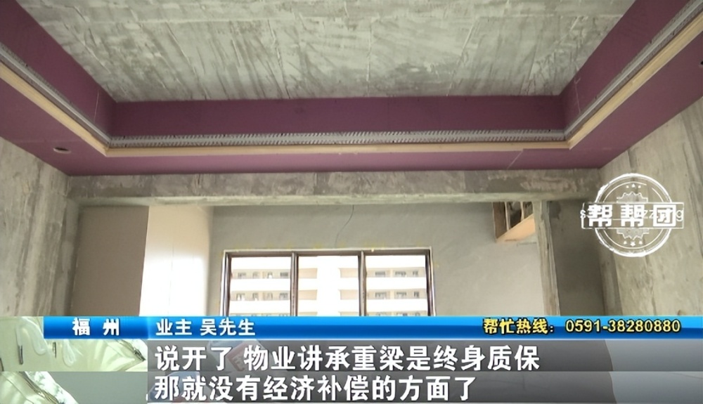物业工作人员表示,吴先生其实不用担心大梁后续问题。因为根据《福建省新建商品房质量保证书》,承重梁等主体结构,开发商会质保到“设计文件规定的合理使用年限”,基本就是“质保终身”。