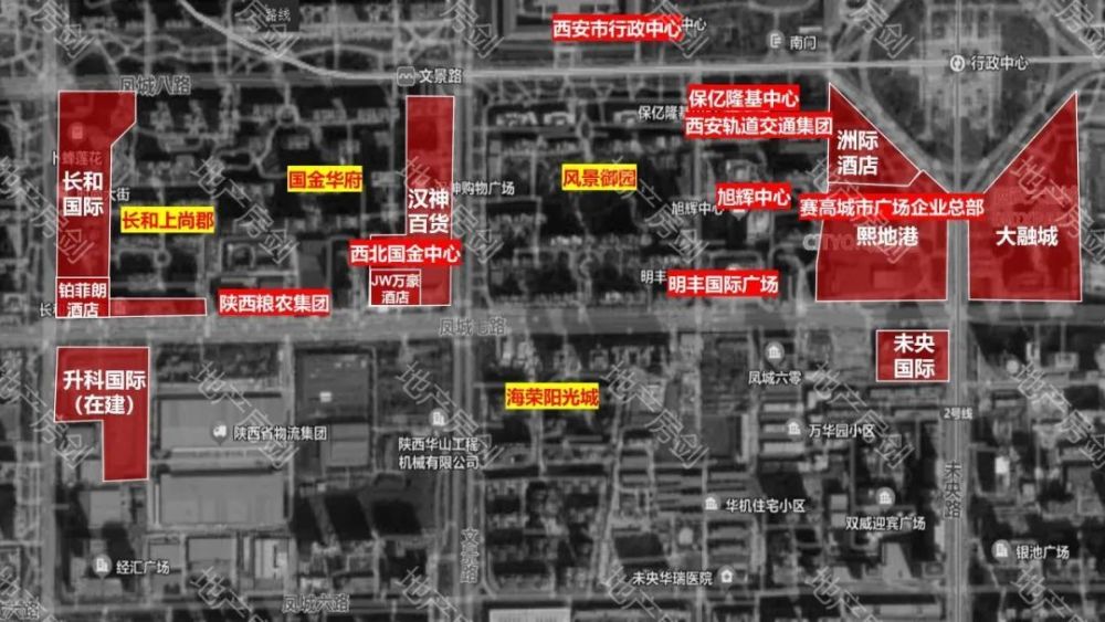目前,凤城七路与未央路十字,已经形成了熙地港、大融城、未央国际三足鼎立的格局,再加上旭辉中心、保亿隆基中心、赛高城市广场企业总部等写字楼,以及经开洲际酒店,行政中心商圈目前已经非常成熟。