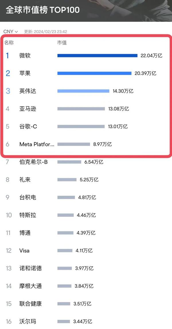 其实不需要最后一名Meta(脸书),微软+苹果+英伟达+谷歌+亚马逊五家总市值就超过了沪深两市总市值。