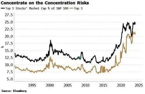 标普500指数中市值排名前五的公司,目前占该指数总市值的四分之一以上,而十年前这一比例仅为约八分之一,美股集中度处于50年来的最高点。