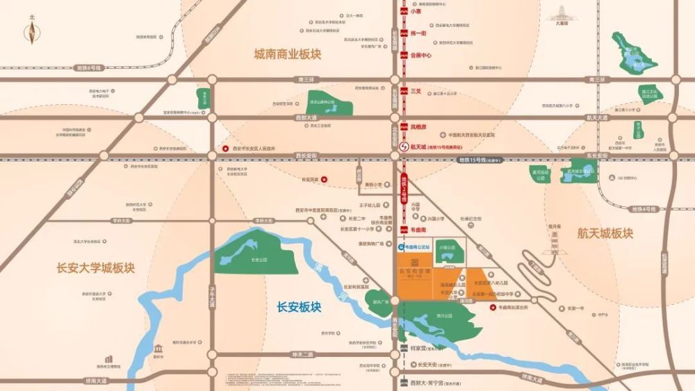 紧邻南长安街与韦曲南商圈,步行到已开通的地铁2号线韦曲南站仅需3分钟左右,乘坐6站即可到达小寨站与3号线换乘去往高新。