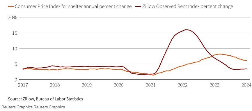 为捕捉当前市场价格(而非官方数据中缓慢变动的平均值)而实时编制的租金衡量指标表明,价格上涨已经放缓。例如,美联储官员密切关注的在线房地产公司Zillow的一项指数显示,截至1月份的租金年增长率为3.4%。