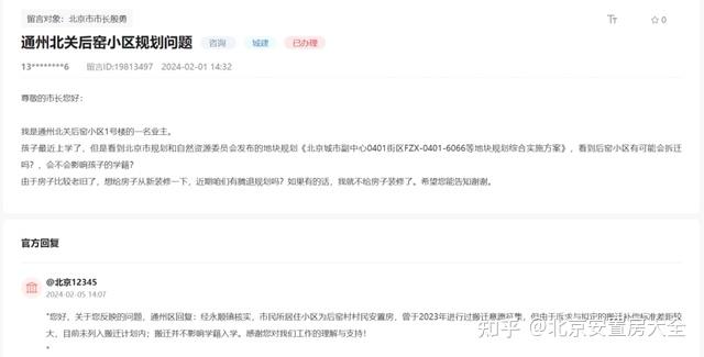 尊敬的市长您好:我是通州北关后窑小区1号楼的一名业主。孩子最近上学了,但是看到北京市规划和自然资源委员会发布的地块规划《北京城市副中心0401街区FZX-0401-6066等地块规划综合实施方案》,看到后窑小区有可能会拆迁吗?,会不会影响孩子的学籍?由于房子比较老旧了,想给房子从新装修一下,近期咱们有腾退规划吗?如果有的话,我就不给房子装修了。希望您能告知谢谢。