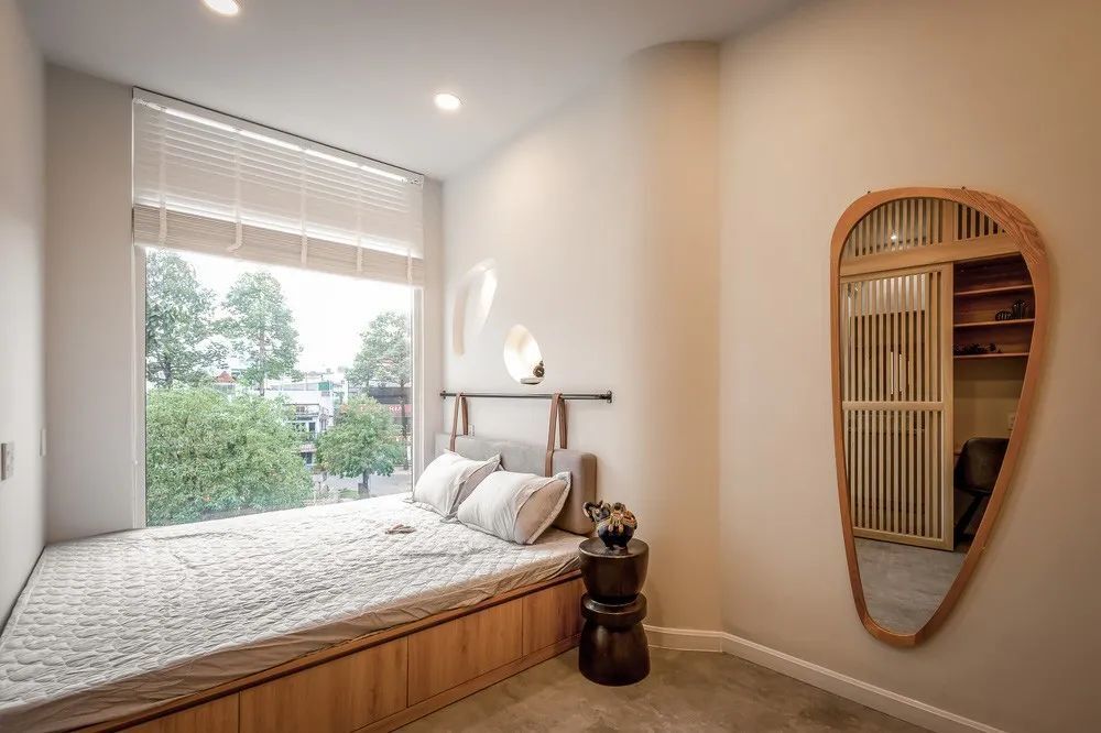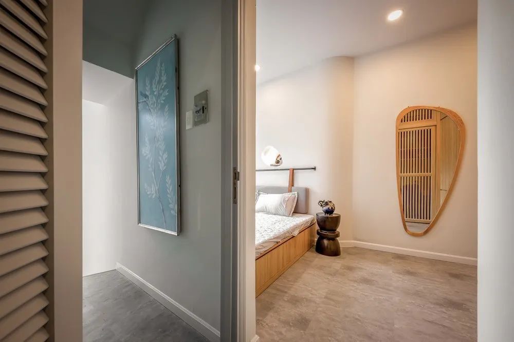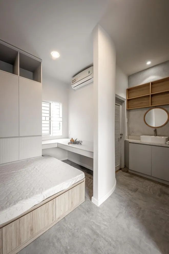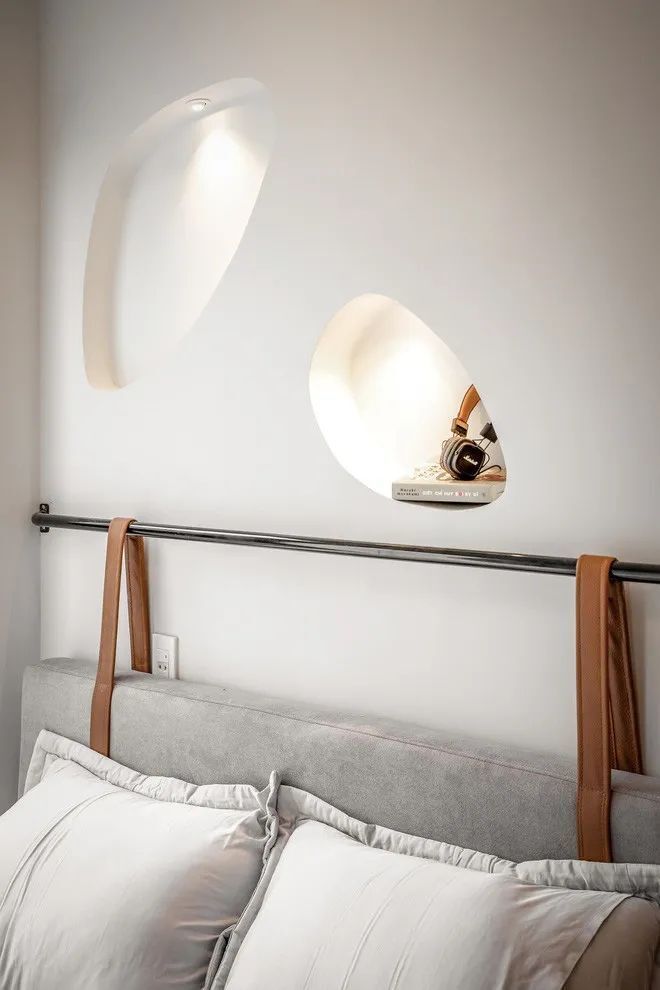 别看主卧小,实则功能丰富,包括床、衣柜、梳妆台、卫生间,业主特地选择了底部可以收纳的床铺,上面休息,下面抽屉储物,床头的两个造型壁龛也是个很大的亮点。