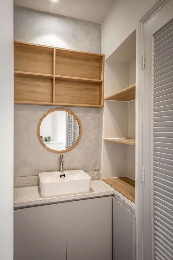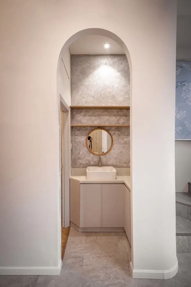一楼卫生间很小,洗漱柜挪到外面,L型柜体除了安装洗漱盆外,也预留了充足的储物空间,上方的隔板也可以利用起来。