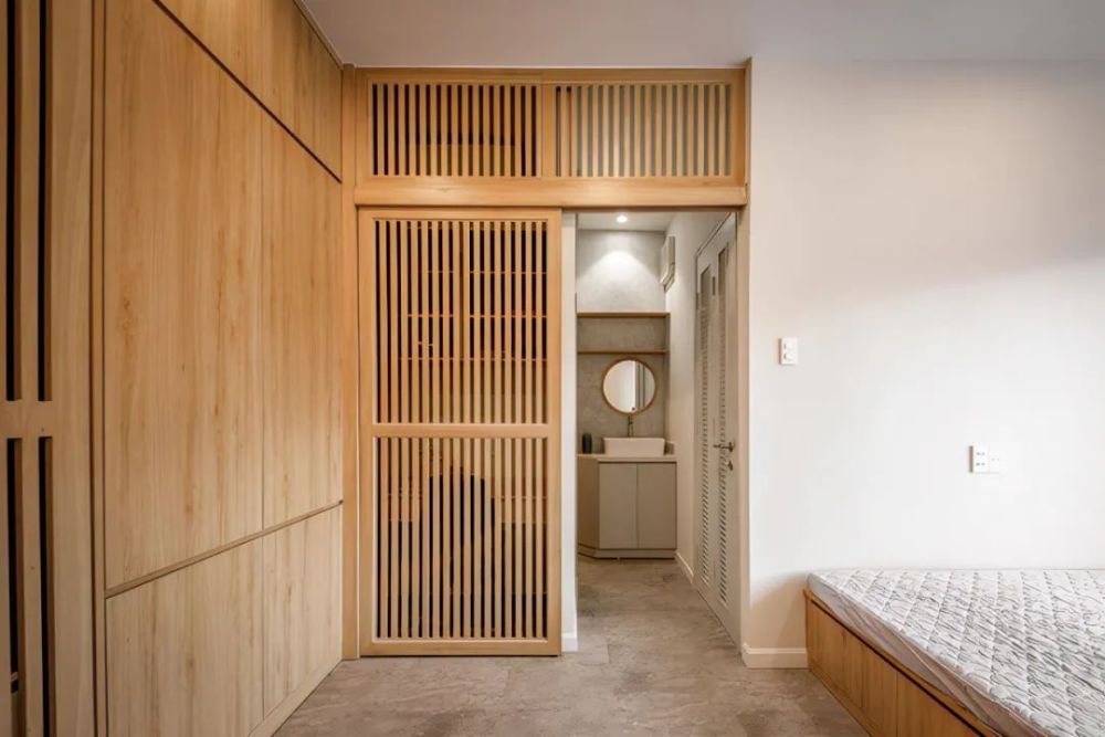 衣柜侧边有个嵌入式小书桌,而另一边则是卫生间,格栅门可以左右移动,既可以是卫生间的门,又能隐藏书房,一门两用。