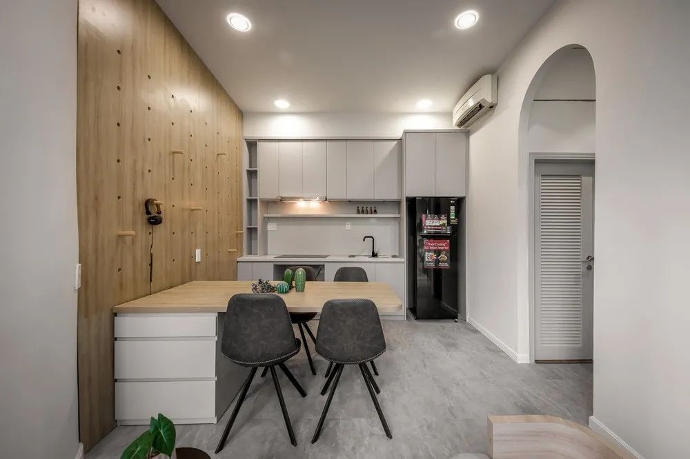 餐厅没有多余空间,就将餐边柜设计在桌子下面,吃饭时随手打开抽屉就能拿到,另外整面墙都设计了洞洞板,安装置物架和吊杆后随处都能收纳。
