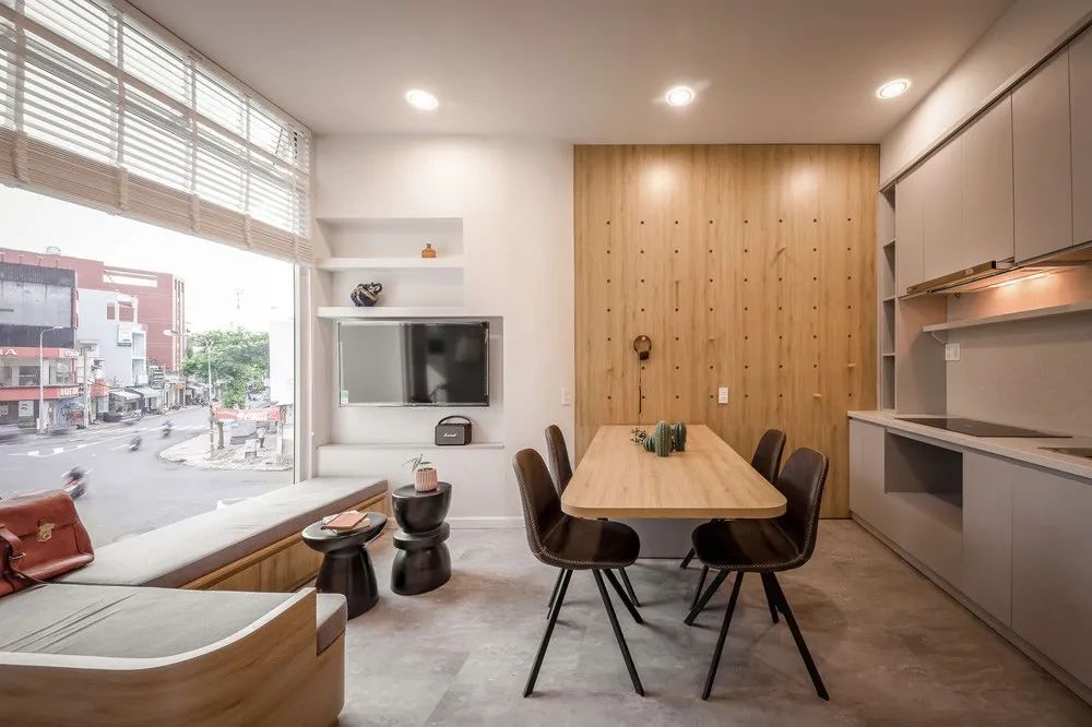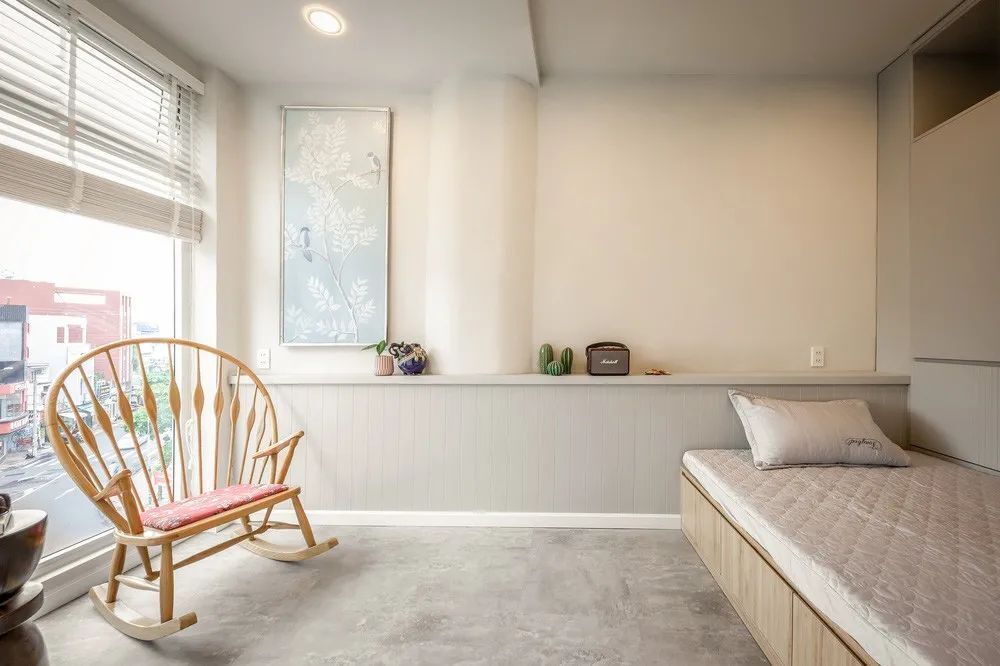 另一边紧靠落地窗设计个L型飘窗,这就算是客厅了,日常休闲或者招待客人都可以,电视直接挂墙上,上方还有壁龛设计,又能解决一小部分收纳,最大程度地减少家具的数量。