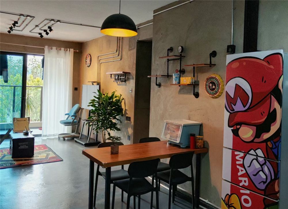 先说餐厅,它的布置也是以深色铁艺木桌和黑色餐椅为主,呼应家中的装修效果,但暖黄光的吊灯,能让冰冷的水泥毛坯房多一抹温馨。