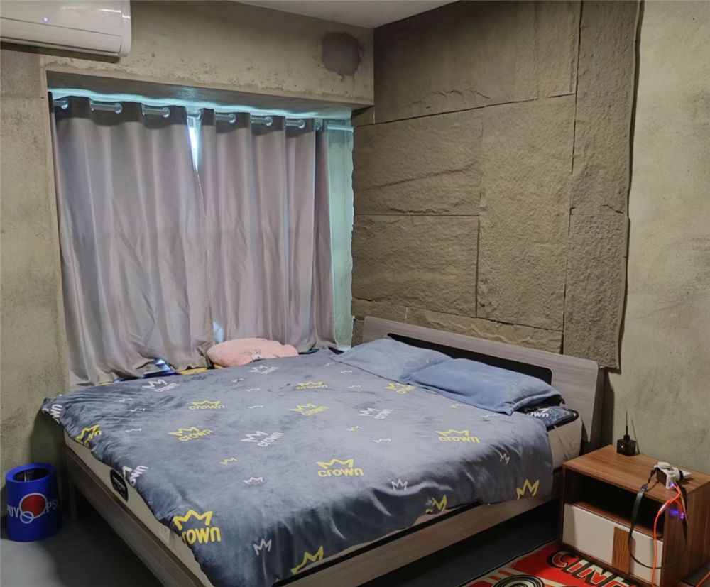 家里有两间卧室,他只装修了其中一间主卧,双人床和床头柜都是买得便宜的板材家具,窗帘也是简易罗马杆和塑料窗帘,别看没质感,但遮光是真的强。