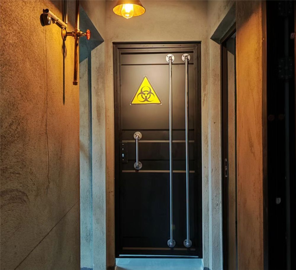 从家里一进门,玄关就给人一种粗犷的水泥质感,为了能显得不太单调,他还在门扇和墙面自己用废旧钢管安装了一些装饰,有点像是那种金属工业风的感觉,还挺有个性。