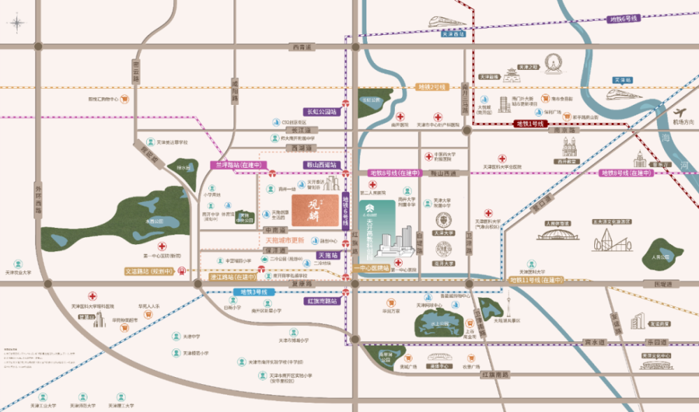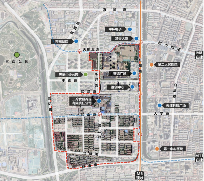 天拖城市更新项目处在鞍山西道与红旗路的交口位置,鞍山西道是南开中部的东西干线,联通包括天南大、百脑汇一系列成熟商业区,而且这条线上直接通往天大与和平,向经过天拖北道链接简阳路城市快速干线,可以实现整个西部片区的无缝衔接。红旗路是南北干线,一路可以通往西站片区,南侧与水上、翠屏公园链接,这个点位是南北东西交通的必经之地。所以6、8、11号线在这个片区内密集设置了5个地铁站。