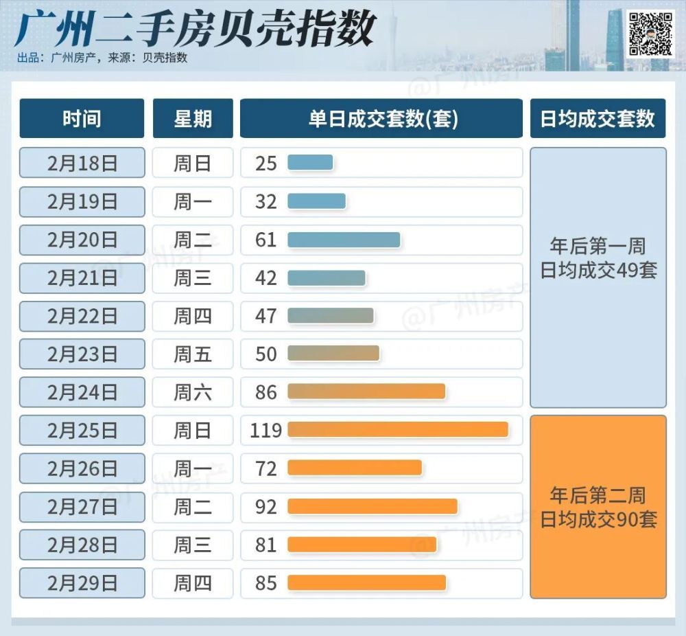 年后,广州二手房市场也迅速升温。根据贝壳找房平台的数据,大年初一到初三,正值拜年走亲戚的时间段,广州二手房成交量为零,初八(2月17日)开始,二手市场的热度一路升温,带看、成交量连续四日上涨,2月20日,二手房成交量达到61套,超过了2月初日均50套的水平。