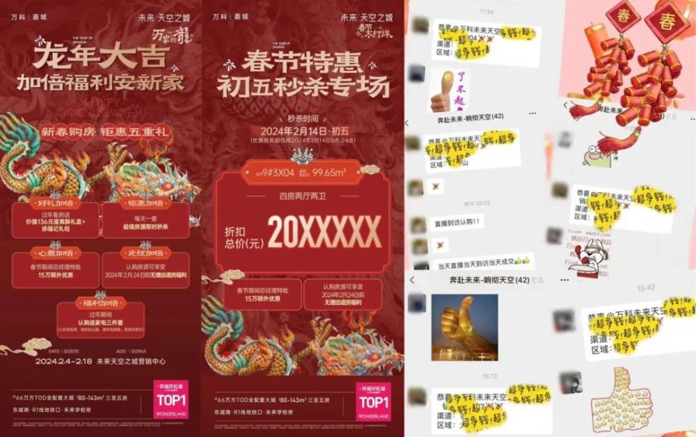 CBD华润置地悦府,春节假期成交额超9600万元,霸榜主城区春节成交金额TOP1;万科中天世纪水岸,春节假期成交额超5000万元,成交套数霸榜主城区TOP1;东城万科瑧山境,春节假期成交额高达3586万元。