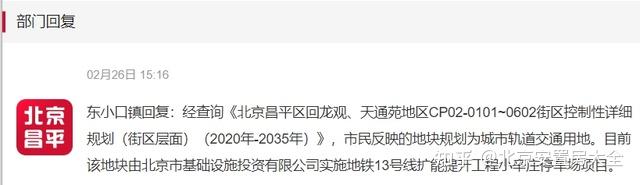 经查询《北京昌平区回龙观、天通苑地区CP02-0101~0602街区控制性详细规划(街区层面)(2020年-2035年)》,市民反映的地块规划为城市轨道交通用地。目前该地块由北京市基础设施投资有限公司实施地铁13号线扩能提升工程小辛庄停车场项目。