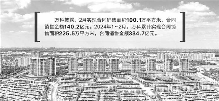 3月14日晚间,万科A披露2024年2月销售及近期新增项目情况简报显示,2月该公司实现合同销售面积100.1万平方米,合同销售金额140.2亿元。2024年1~2月,万科A累计实现合同销售面积225.5万平方米,合同销售金额334.7亿元。