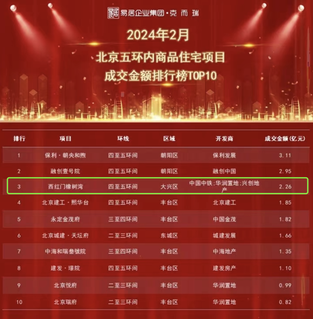 在克而瑞公布的2024年2月北京五环内商品住宅项目成交金额排行榜TOP10的榜单中,大兴区有且仅有西红门橡树湾一个项目荣登榜单,并且还成功跻身前三名。